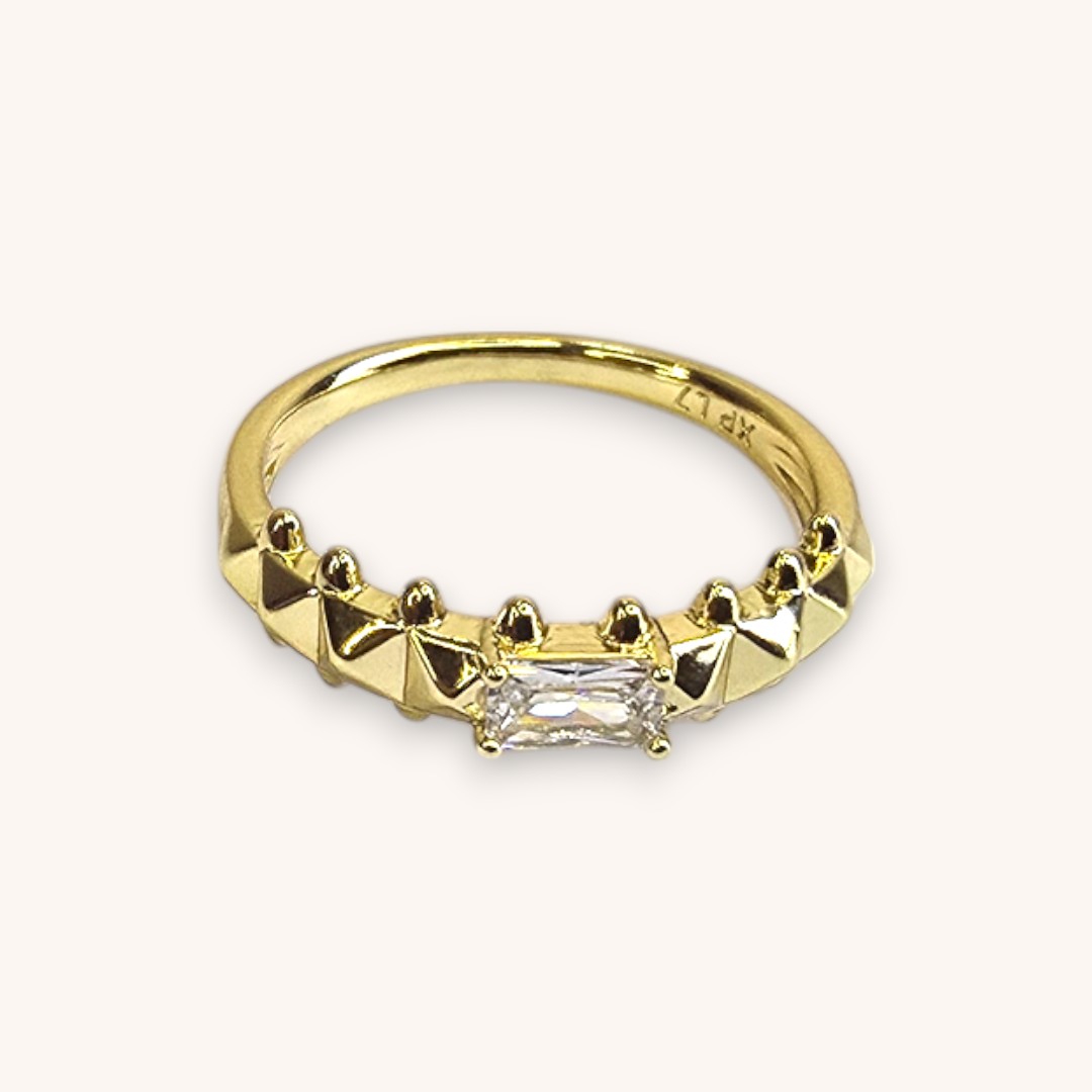 Avec ses motifs étoilés et sa pierre centrale rayonnante, cette bague ajoute une élégance discrète mais remarquable à chaque geste.