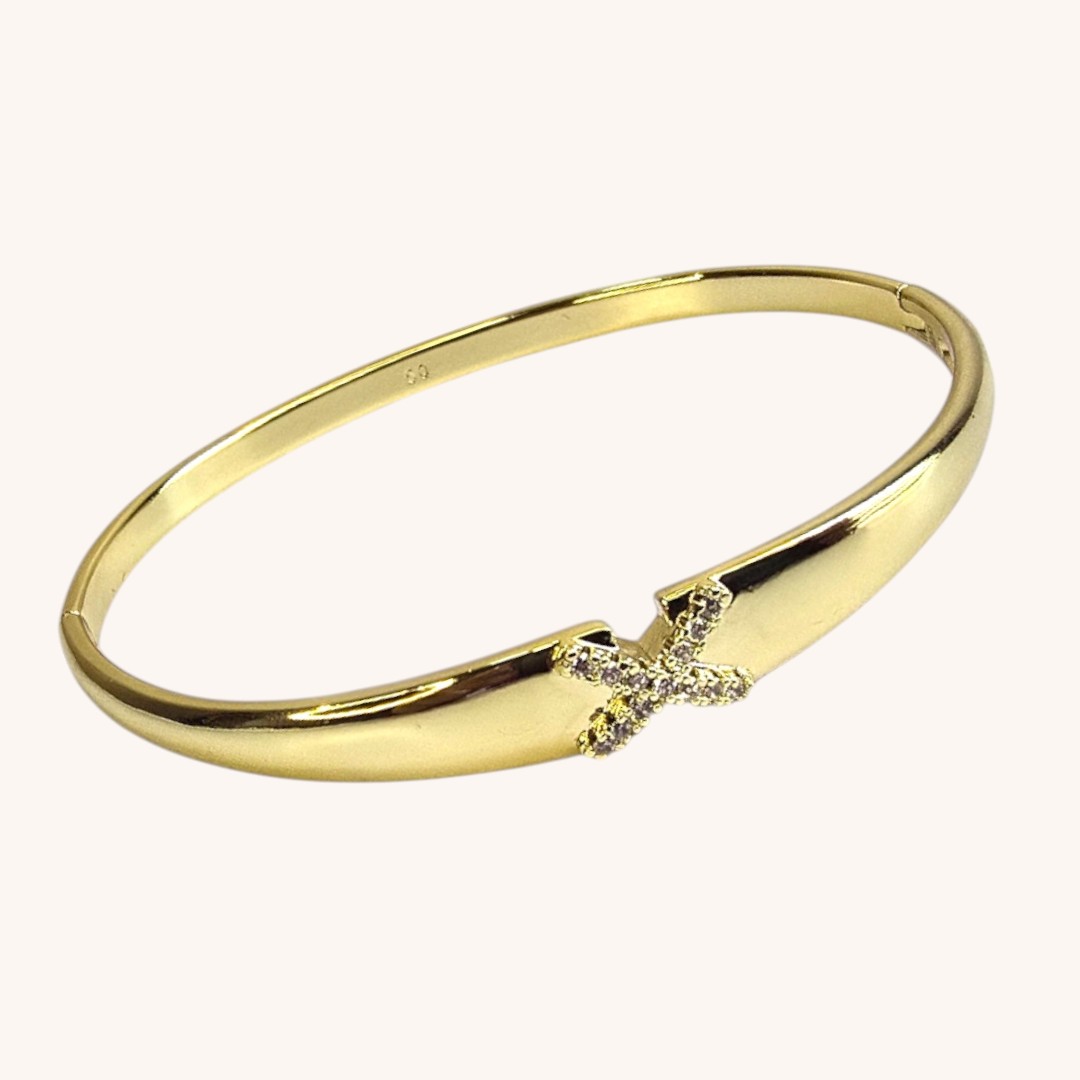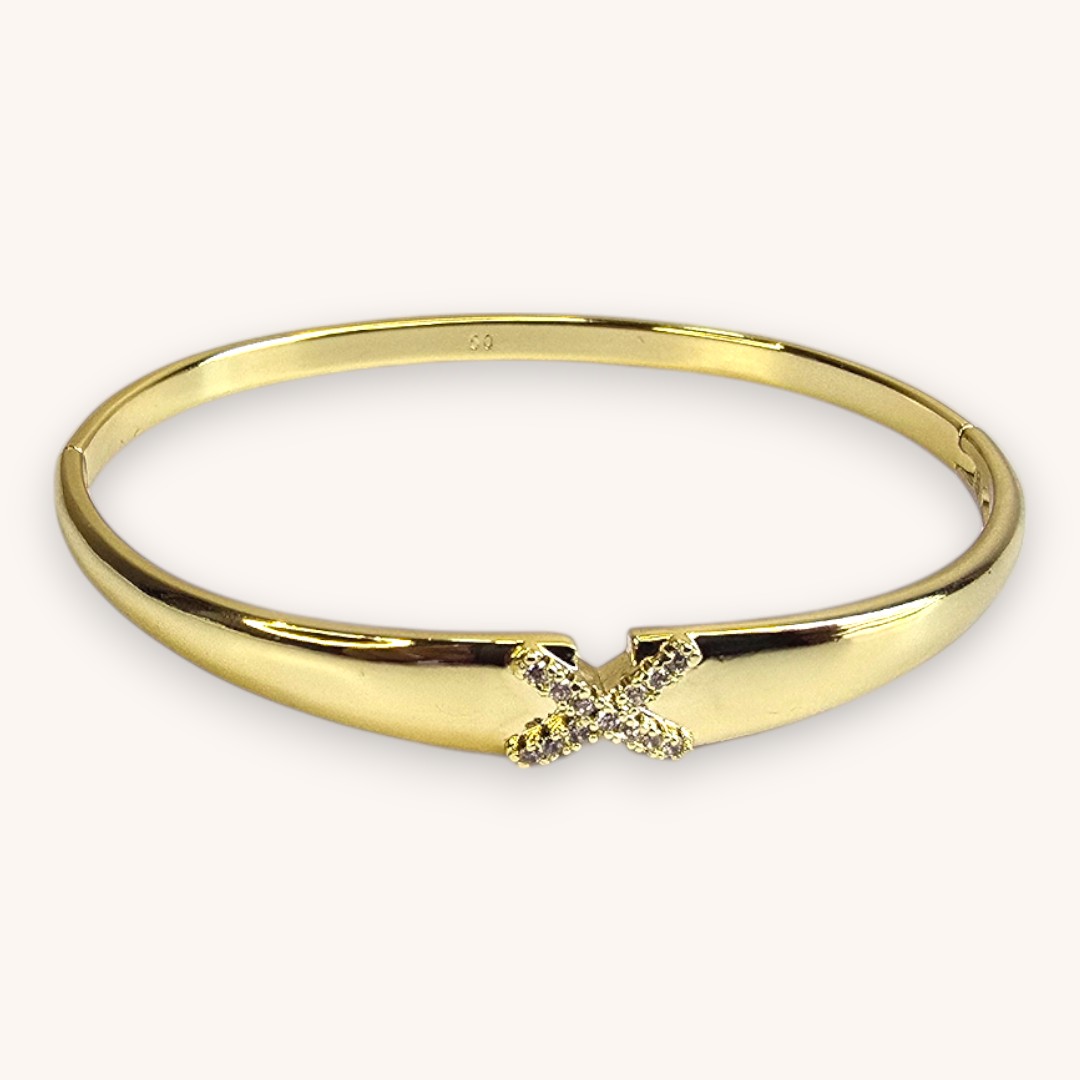 Ce bracelet doré, avec son motif croisé raffiné et ses finitions étincelantes, rehausse subtilement vos tenues. Une pièce qui allie confort et élégance, parfaite pour sublimer votre poignet au quotidien.