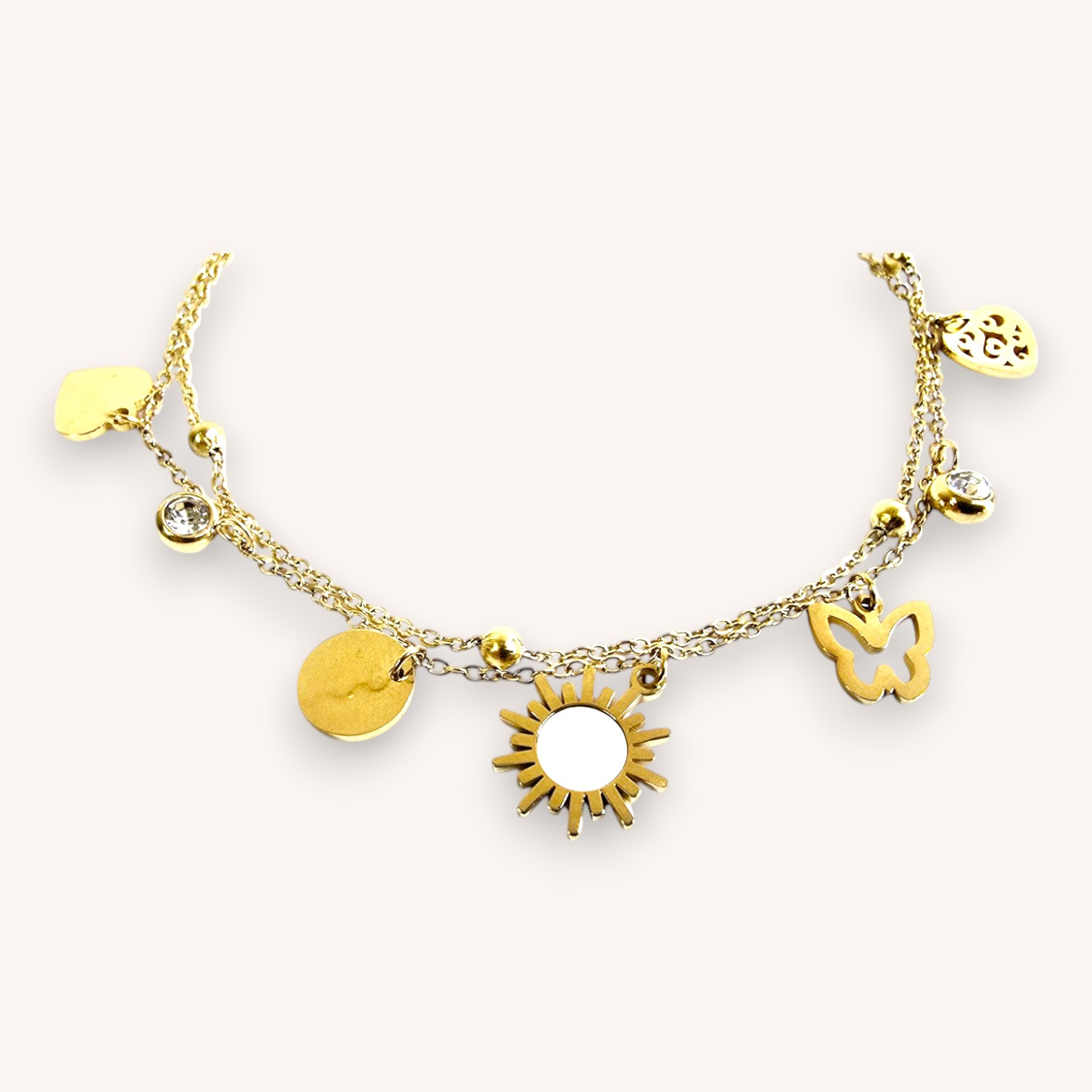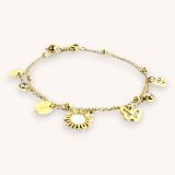Laissez-vous séduire par cette chaîne de cheville dorée ornée de charmants pendentifs : un papillon délicat, un soleil étincelant et des motifs naturels qui évoquent la lumière et la légèreté. Parfait pour ajouter une touche radieuse et poétique à vos looks estivaux. Ce bijou célèbre la féminité et la joie de vivre avec un style intemporel.