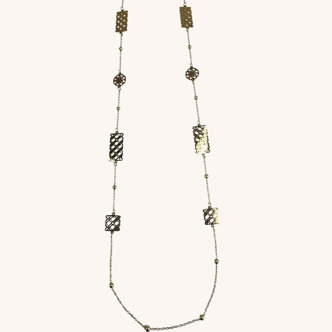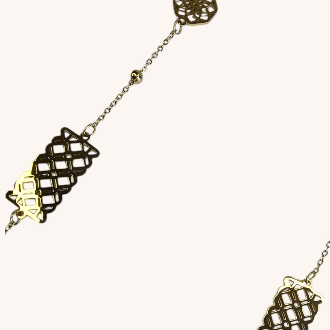 Un bijou contemporain qui allie la finesse de l’or à la pureté des lignes géométriques. Les pendentifs rectangulaires, délicatement entrelacés, apportent une touche de modernité à cette chaîne. Parfait pour celles qui aiment les bijoux épurés et raffinés.