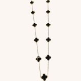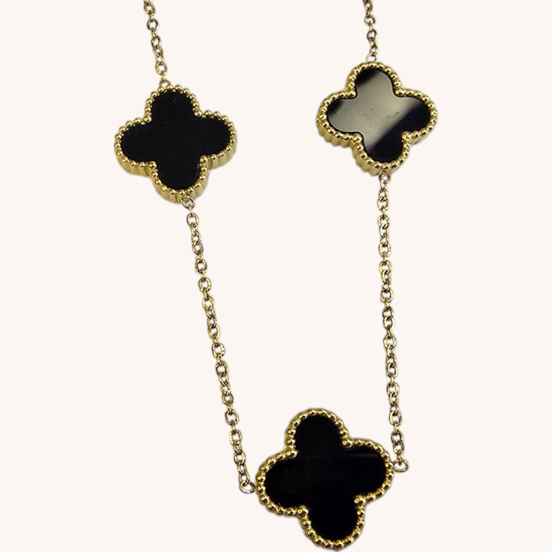 Laissez-vous séduire par cette délicate chaîne ornée de trèfles noirs, symboles universels de chance et de bonheur. Le contraste entre l’or et l’onyx apporte une touche de sophistication à ce bijou intemporel, parfait pour toutes les occasions.